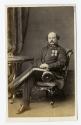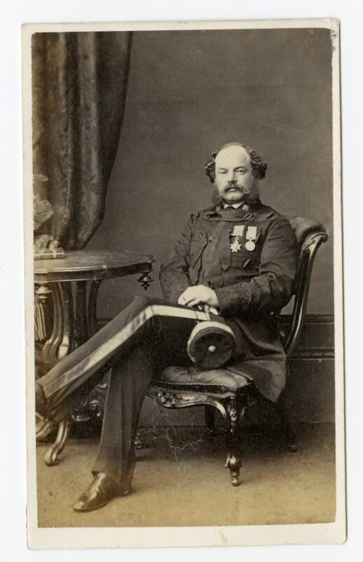 About MeCarte de visite of a man sitting with his legs crossed in a plush chair next to a table with a book on it and a hanging curtain. His hair is styled neatly and he has sideburns and a moustache. he is wearing a coat with long sleeves and medals pinned to his chest on the left. Possibly military (?) His trousers have a single stripe going down the outside and he is also holding a cap in his hands which are folded on his lap.Photographer's full print details can be seen on reverse side as well as the letter 'C' hand-written in pencil. c.1860s