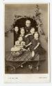 About MeCarte de visite of a family pictured in a fake window with a decorated ledge, (from left to right): there is a girl wearing a dark dress and white collar. Next to her is a woman, presumably her mother who is wearing a dress with a light lace trim collar and brooch, she is also holding an infant. The infant is in a light dress with a patterned hem. Next is presumably the father who has a large beard. The next child is wearing a dress and a hairband and her right arm is slightly raised. Finally the last child is seated on the ledge in a dark dress with white socks and boots and is looking directly at the camera. Photographer's full print details can be seen on reverse side as well as the letter 'E' hand-written in pencil. c.1860s
