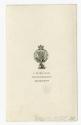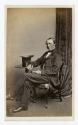 About MeCarte de visite of a man sitting on a plush chair with his right arm resting on a table with an upturned top hat on it. He has sideburns and is wearing a coat with a matching suit, white shirt and dark necktie, possibly velvet material. A pocketwatch chain can be seen inside his waistcoat. He is holding a cane in his right hand and a pair of gloves in his left and his legs are crossed. Photographer's full print details can be seen on reverse side. c.1860s