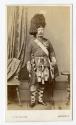 About MeCarte de visite of a man in full military regalia and kilt. He is holding a sword in his left hand, a table can be seen in the background as well as a chair and a hanging curtain. There are medals on his left breast. Photographer's full print details can be seen on reverse side.