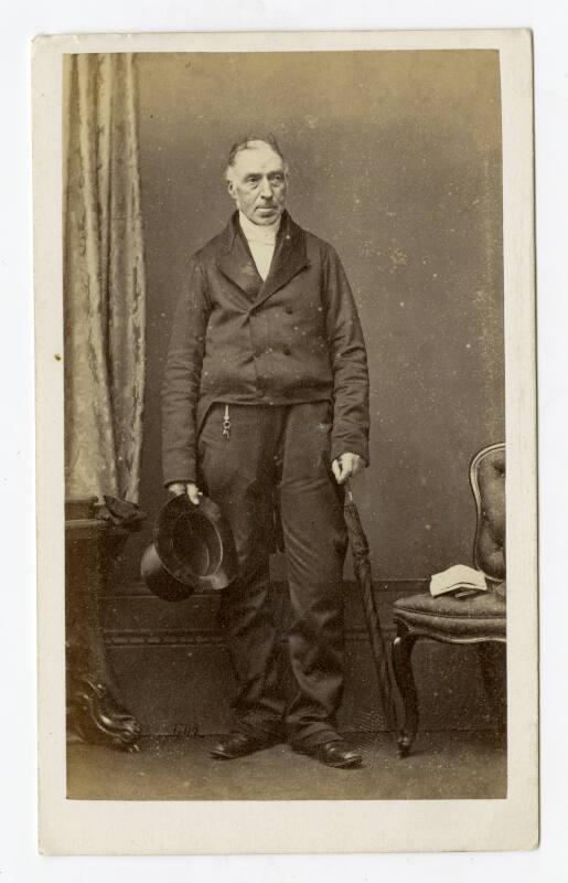 About MeCarte de visite of a man standing next to a chair with a hanging curtain and desk to the left in the background. He has sideburns and is wearing a full suit with a tail coat. He is holding a top hat in his right hand and an umbrella in his left. A key chain can be seen dangling from his waistline.