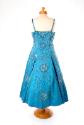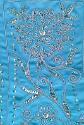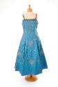 This stunning dress was made by a dressmaker and dates to the late 1950s. It has been heavily trimmed with floral embroidery, sequin tambourwork, frogging and diamanté stones. The skirt section has gored panels with inset fishtail sections, which add fullness and swing to the skirt, perfect for dancing. The dress was worn, possibly with the blue lurex shoes also on display, by Wilhelmina Archer Hay (neé Yeaman), the donor's mother.