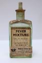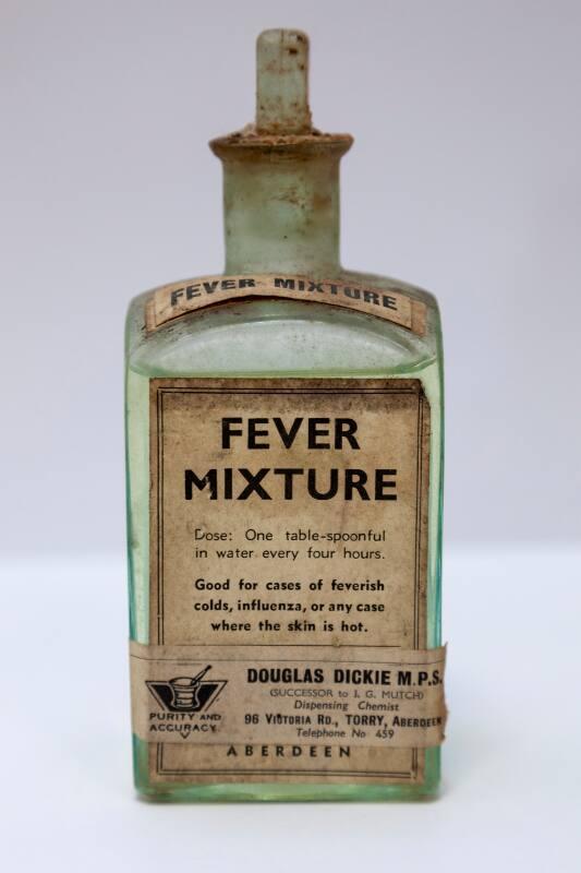 About MeClear glass square bottle with clear liquid inside labelled Fever Mixture. The three labels are cream with black text. The lid is a stopper with a square cut top.The object is from a ship's medicine chest from an Aberdeen trawler that was wrecked off Hoy.