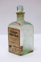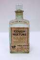 About MeClear square glass bottle with a very small amount of amber liquid in the bottom labelled "Cough MIxture". The two labels are cream coloured with text typed text. The lid is a square glass stopper.The object is from a ship's medicine chest from an Aberdeen trawler that was wrecked off Hoy.
