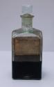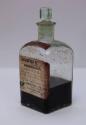 About MeClear square glass bottle with a dark brown liquid inside labelled "Rheumatism Mixture". There are two labels, the top one is a red label with black text, the front label is a cream one with black text and black handwritten text. The lid is a square stopper.The object is from a ship's medicine chest from an Aberdeen trawler that was wrecked off Hoy.
