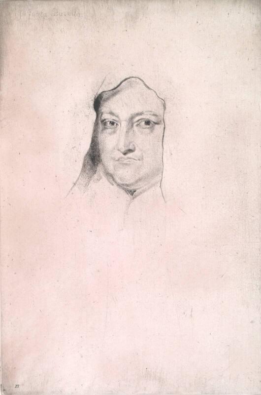 A derivative work of Ruben's Portrait of Isabella Clara Eugenia, who is wearing the habit of the Sisters of St. Clare. For what purpose might Geddes have chosen to only draw the sovereign’s disembodied face?