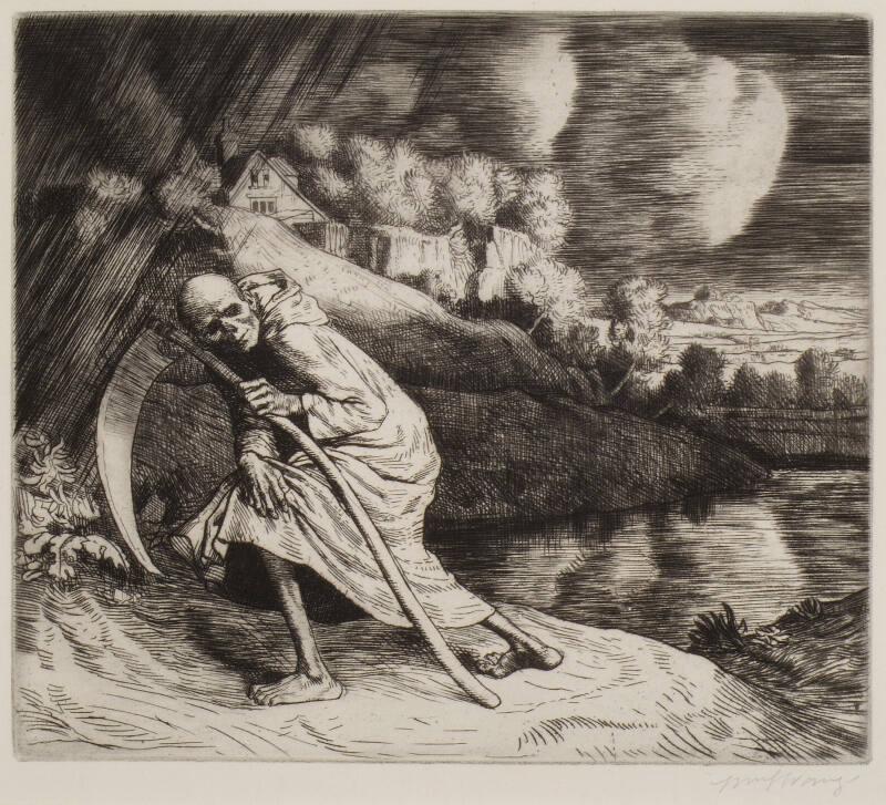 Here we see a deathly figure, totally distinct from reality, scythe in hand, lurching toward the outskirts of the etching. This piece is concerned solely with aesthetics and precision. He is seen 'cultivating ugliness' [Studio 1921] in this skull-ridden figure, yet Strang never fails to outdo the notion of the unpleasant itself, with the power of beautiful craftsmanship.