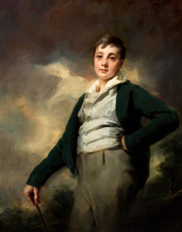 About MeThis portrait of John Gray of Carntyne (1800-1867) as a thirteen-year-old boy dates from Raeburn's finest period. A low set landscape background with a stormy sky gives the picture a romantic dimension.In this striking work, Raeburn has perfectly captured the sitter's lively appearance and compelling eyes. The contrast between his child-like face and almost regal, adult stance suggests that he is pausing before making the step from childhood to manhood.