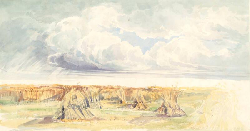 This work is undated, however it is likely to be one of the many panoramic landscapes painted by the artist from 1867 onwards, amongst which are numerous harvest scenes such as this one. The neat stacks of corn are depicted beneath a cloud-laden sky, the left half of which shows streaks of falling rain whilst the right remains bright, causing cast shadows amongst the corn. Indeed, light effects are the most charming aspect of this water colour, in which Lady Dunbar demonstrates her prowess with the medium by overlapping layers of transparent washes.