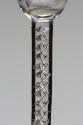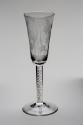 During the 17th century glass was taxed by weight, so hollow stems or tears of air were introduced to make it lighter. In the Georgian period the wealthy were looking for something different and the principal of the tear was extended. From two to twelve of these tears were introduced into a squat cylinder of glass that was heated, drawn out and twisted to give a pattern of filaments of air just below the surface of the glass. Two tears can be used to produce a mercury twist so named because it reflects the light to give a delightful quicksilver effect. Twelve evenly produced filaments are much more common, forming what is known as a multiple spiral air twist. This glass dates to the period between seventeen-fifty and seventeen-sixty-five.