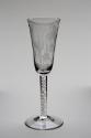 This ale flute features a slender funnel bowl on a straight stem with a double mercury twist on conical foot. The bowl is engraved with two ears of corn and growing hops with flowers and fruit.