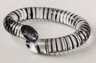 About MeThe clear perspex coil has been twisted to form a bangle. Grooves have been cut along the perspex coil and dyed black to create a segmented optical effect.Modern jewellers often questioned the perception of value when non-precious materials such as plastics, paper and textiles are exploited as an alternative to precious metals.