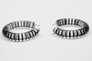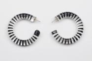 About MeTwo clear perspex coils have been twisted to form earrings. Grooves have been cut along the perspex coils and dyed black to create a segmented optical effect.Modern jewellers often questioned the perception of value when non-precious materials such as plastics, paper and textiles have been exloited as an alternative to precious metals.