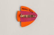 The decoration on this patterned brooch is achieved by engraving, inlaying, and painting with hard finish enamel paints on the reverse of the acrylic. Resins protect these surfaces from wear.