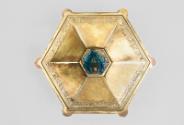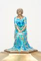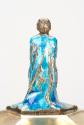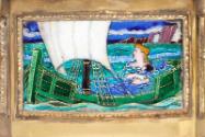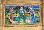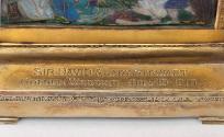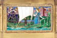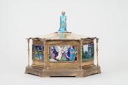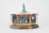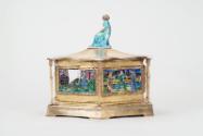 Hexagonal lidded casket featuring six enamelled panels around sides illustrating the Man of Law's tale from Chaucer's Canterbury Tales; each panel is enamelled in colours of blue, green and gold and illustrates a scene relevant to the motto beneath each panel. There is a seated female figure in turquoise flowing gown on the apex of the cover. The casket is lined in silk velvet.