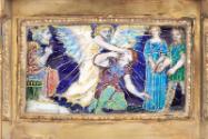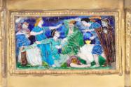 The casket illustrates two differing enamel techniques. The seated figure is covered in opaque enamel. The panels imitate cloisonné, where enamels are fired within raised metal outlines or cells.