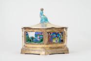 Hexagonal lidded casket featuring six enamelled panels around sides illustrating the Man of Law's tale from Chaucer's Canterbury Tales; each panel is enamelled in colours of blue, green and gold and illustrates a scene relevant to the motto beneath each panel. There is a seated female figure in turquoise flowing gown on the apex of the cover. The casket is lined in silk velvet.