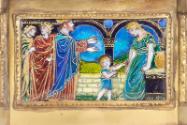 The casket illustrates two differing enamel techniques. The seated figure is covered in opaque enamel. The panels imitate cloisonné, where enamels are fired within raised metal outlines or cells.