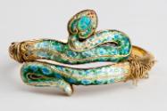 In this bangle, gold foil under the enamel of the head and tail serves to add more brilliance to the overlying colour
