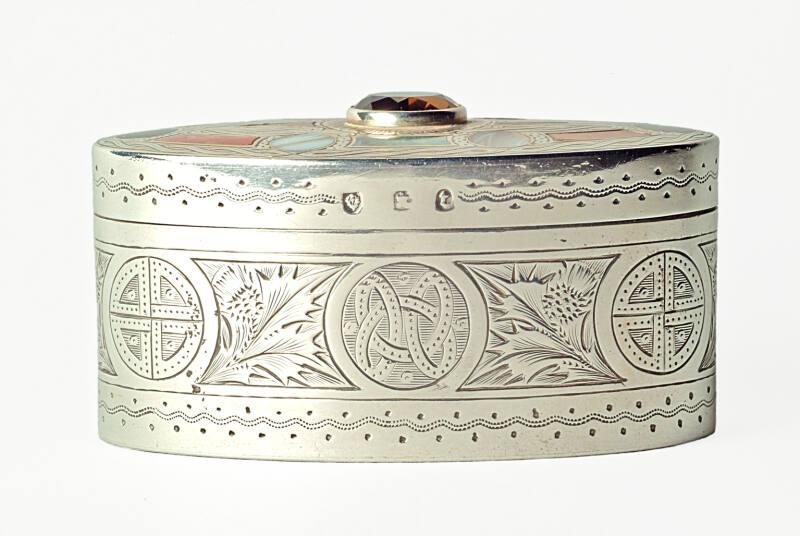 About MeWilliam Robb was a goldsmith, and a native of Aberdeen. He settled in Ballater in eighteen-eighty and thus is known as 'Robb of Ballater'. Engraved with Celtic designs and thistle motifs, the snuff box is also set with agates and a central, semi-precious stone. This snuff box dates from 1893-1904.More About Me