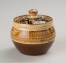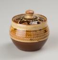 About MeThis lidded jam or honey pot is of a squat, bulbous form with short neck. The circular cover sits within the pot's recessed rim.The pot is decorated in cream and brown slip (liquid clay) which has been combed through to create a feathered pattern. to create a feathered pattern, whilst the cover has a hand-painted decoration of dots and meandering ribbon in brown on cream slip.