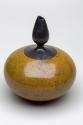 About MeBlack raku stoneware pot with bulbous round body and a slim concave neck that has a tall altered flattened top. The body of the pot has been glazed in mustard, green and red streaked lustre and slip.Andrew Hill is heavily influenced by Eastern Ceramics, which led him to specialise in thrown work as well as the techniques of Raku firing. The result is a dramatic contrast of vibrant, spontaneous colour against a carbonised black.