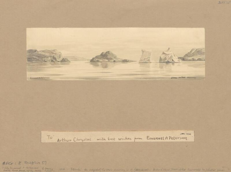 About MeWith a combination of pen, ink and wash Emanuel A. Peterson's depicts a seascape in Greenland, with its isolated, shapely icebergs protruding from the ocean and arranged neatly along the picture plain. There is an eerie calm to the work as the horizon falls almost in the centre of the paper and both the sea and sky remain flat and unthreatening. The study is dedicated to Peterson's friend, fellow artist Arthur Chrystal (1904-1978), as the inscription reveals, 'To Arthur Chrystal, with best wishes from Emanuel A. Peterson, June 1934'.Allart van Everdingen