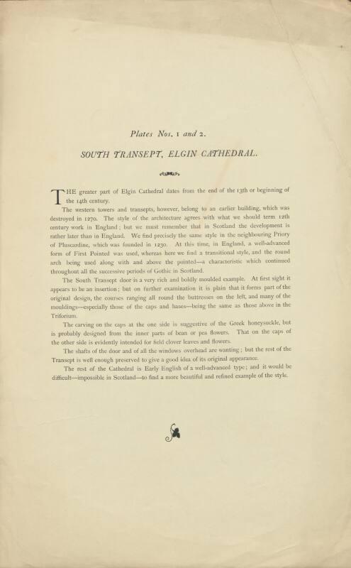 Plans of Local Architectural Features - South Transept, Elgin Cathedral (printed page) plates nos. 1 & 2.