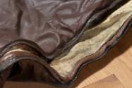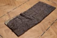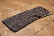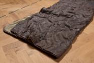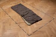 With its apparently grubby surface, its plains of soft hills and valleys with rifts and ridges, the sleeping bag recalls a natural landscape. Through the snake-like zip the inner lining can be seen. Yet this sense of padded softness is false. It is a solid object; the fabric can never change. Every crease and fold is cast in bronze, the casually rumpled, padded nylon form is fixed in space forever.