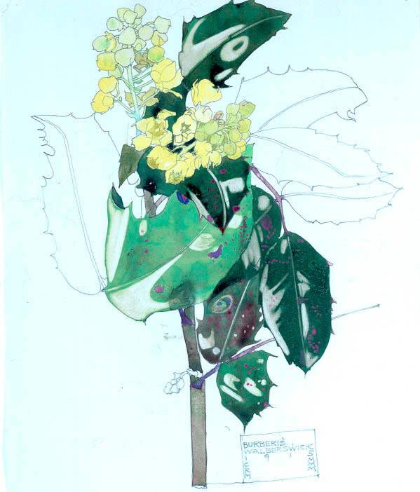 About MeCharles Rennie Mackintosh and his wife Margaret Macdonald had moved to Walberswick on the Suffolk coast in 1914, when they believed their situation in Glasgow had become intolerable. Unable to obtain sufficient architectural or interior design commissions, the two abandoned the city in favour of this retreat where Mackintosh devoted his time to painting exquisite watercolours of shrubs, herbaceous plants and wild flowers. 'Berberis' was one of some forty plant studies painted at Walberswick between 1914 and 1915. Although Mackintosh has often been admired for his botanical accuracy, the plant depicted here has been identified as mahonia and is not in fact a berberis.