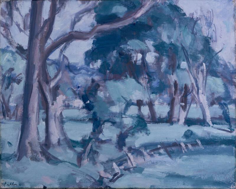 In some of his final landscape works a freer, vaguely expressionist approach to his subject is noticeable. The structural qualities of previous landscapes have disappeared here and instead, Peploe renders the limbs of the trees with broad, swooping, unhidden brushstrokes. He has bypassed bright, pure colour for more muted, tonal blues, greens and browns to give a sense of atmosphere and setting.