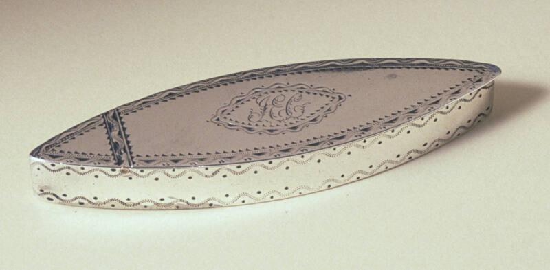Purchased from Birmingham by James Gordon who added his own punch IG before reselling. Birmingham was a centre for the box making industry and this object provides evidence of Gordon purchasing high quality ready-made items for resale in Aberdeen.