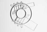In this stainless steel bangle Watkins has retained his loyalty to the geometric shape of a circle, but has extended beyond the confines of the diameter with open wire leaves and protruding rectangular forms. The corners are cut (rather than assembled) with an incredible precision and sharpness of line.
