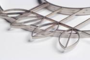 In this stainless steel bangle Watkins has retained his loyalty to the geometric shape of a circle, but has extended beyond the confines of the diameter with open wire leaves and protruding rectangular forms. The corners are cut (rather than assembled) with an incredible precision and sharpness of line.