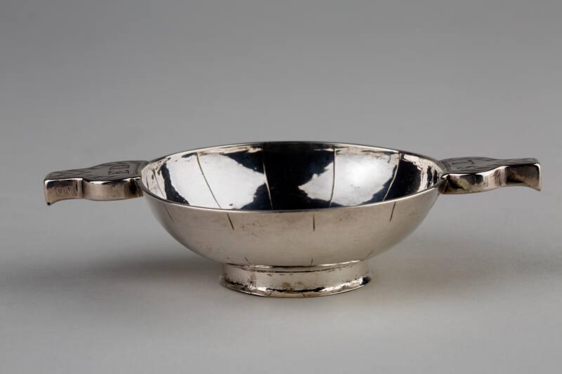 More About MeThe two pear-shaped lug handles are engraved with a decorative border and the initials ED and TS, possibly to commemorate an event such as a marriage.