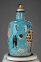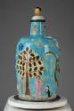 The lid is an inverted bowl featuring the hollow head of a child, which is painted in ochre with dark-lined eyes, dark cheeks and lips and black hair. Moulded motifs are applied all over the pot, and many are accompanied by inscriptions in Braille.