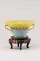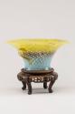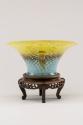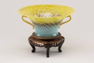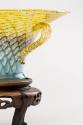 About MeLarge flared and footed bowl in shades of blue and yellow glass in a weave pattern with all over mica particles and two pierced handles. The bowl sits on its original stand.The bowl was a special commission, presented by Isobel Moncrieff to Isobel Maclagan of Perth on her wedding.