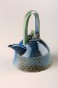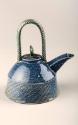 This salt glazed stoneware teapot has spiralling notched lines created by pressing into the body with a roulette before firing. The crisp linear effects on the handle and knob are the result of rolling the clay on a surface with a defined pattern.