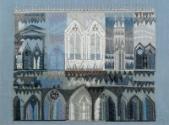 A layered collage with gold thread laid embroidery of various Gothic ecclesiastical windows.