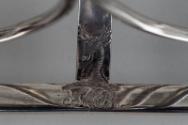 The rack stands on four ball feet, with nine double loop wire-work divisions and central ring handle. It is engraved with initials 'JMB' and a stag's head crest.