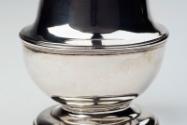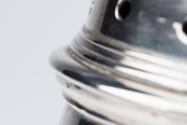 Castors were used for sprinkling spices, sugar and other condiments and generally came in sets of three. This particular castor is for sugar, as indicated by the large size of the holes on the cover. The quality of the piercing and fit of the lid is the most important feature of a castor. From 1770 onwards castors lost their popularity in favour of sugar bowls. This castor is engraved with the crest and motto of the Urquhart family.