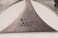 This brooch by Middleton Rettie and sons is formed as a Maltese cross set with grey granite from the Rubislaw quarry, Aberdeen. It fastens with hinged pin across back and has a suspension loop so that it can be worn as a pendant.