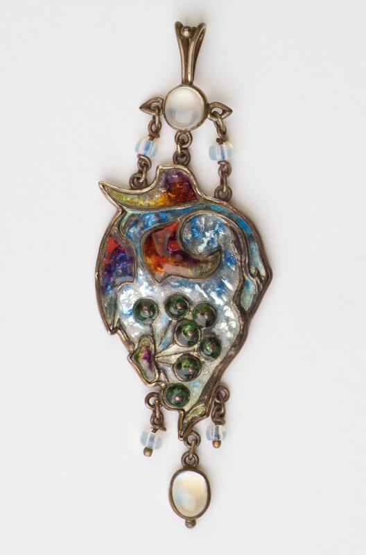 About MeJames Cromar Watt was an Aberdonian architect, artist and a jeweller, and was a member of the Royal Institute of British Architects.This pendant features pale blue and purple foiled enamels, triple drop set au cabochon with moonstones and a pronged loop with central au cabochon moonstone setting. It is a good example of Cromar Watt's interest in precious stones and metals.