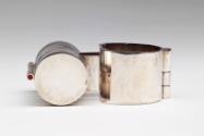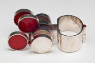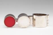 About MeA chunky silver bracelet with a mounted pin and bolt complete with seven silver discs, inlaid with red polyester resin which are joined by a the pin and bolt at the base to allow free movement of each disc rotating around the pin when the bracelet is worn.Kinetic jewellery, jewellery that moves, was very fashionable in the 1970s.