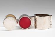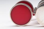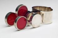 About MeA chunky silver bracelet with a mounted pin and bolt complete with seven silver discs, inlaid with red polyester resin which are joined by a the pin and bolt at the base to allow free movement of each disc rotating around the pin when the bracelet is worn.