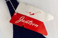 About MeThis wool swimsuit has a V-neck, Y-shaped back and bow trunks under a modesty skirt with a square-cut hem.It was made in England by Jantzen and has their famous diving girl logo on the lower left of the modesty skirt. This logo was based on Olympic divers and was first used in 1923.