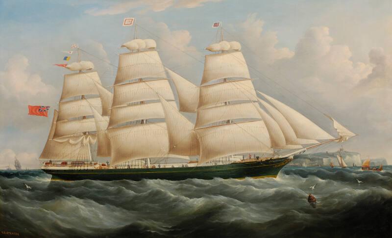 Description: Ship rigged clipper, 2 decks and a poop and forecastle, 3 masts, round stern, eagle figurehead.
